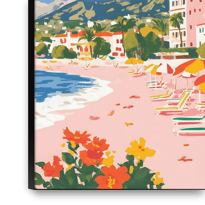 Een zonnige strandillustratie met palmbomen, ligstoelen en helderblauw water. Dit werk ademt vakantie, vrijheid en mediterrane lichtheid. Ideaal om een ruimte direct een zomers gevoel te geven.