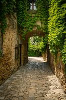 Dit is het romantische steegje in het middeleeuwse dorpje Peratallada in de Costa Brava in Catalonïe ( Spanje). Het is mooi begroeid met nu nog groene wilde wingerd. Het plaveisel is nog redelijk authentiek met de stenen die ze in de omgeving vonden. Dit is een ideale foto om kamerhoog te gebruiken als fotobehang.