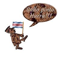 Cartoon Costa Rican gallo pinto Grüntyers character celebrates the dish of rice and beans.
