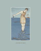 Een historische mode prent in een modern jasje: "Costume de bain - blauw". Geïnspireerd door de Art Deco, een stijlbeweging die opkwam in de jaren twintig van de vorige eeuw. Nieuw zakelijkheid gemengd met moderne strakke lijnen en kleuren.