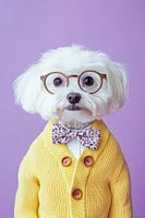 Met zijn pluizige, sneeuwwitte vacht en grote, expressieve ogen straalt deze Coton de Tulear charmante intelligentie uit. In een kleurrijke, knuffelige trui en een modieus strikje ziet hij er bijna uit als een kleine professor die klaar is om de wereld te veroveren met zijn onvermoeibare charisma. Een echte blikvanger in elke situatie!