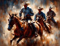 Drie cowboys zijn afgebeeld op paarden in volle galop, wat de scène een gevoel van beweging en intensiteit geeft. Ze dragen traditionele westernkleding met wijdgerande cowboyhoeden en lijken gefocust op een pad voor zich, wat een gevoel van doelgerichtheid en vastberadenheid suggereert.