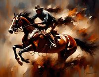 Een paard en ruiter galopperen snel door een dynamische, abstracte scène met heldere spatten van kleur en beweging. De ruiter, gekleed in traditionele cowboykleding, lijkt geconcentreerd en vastberaden.