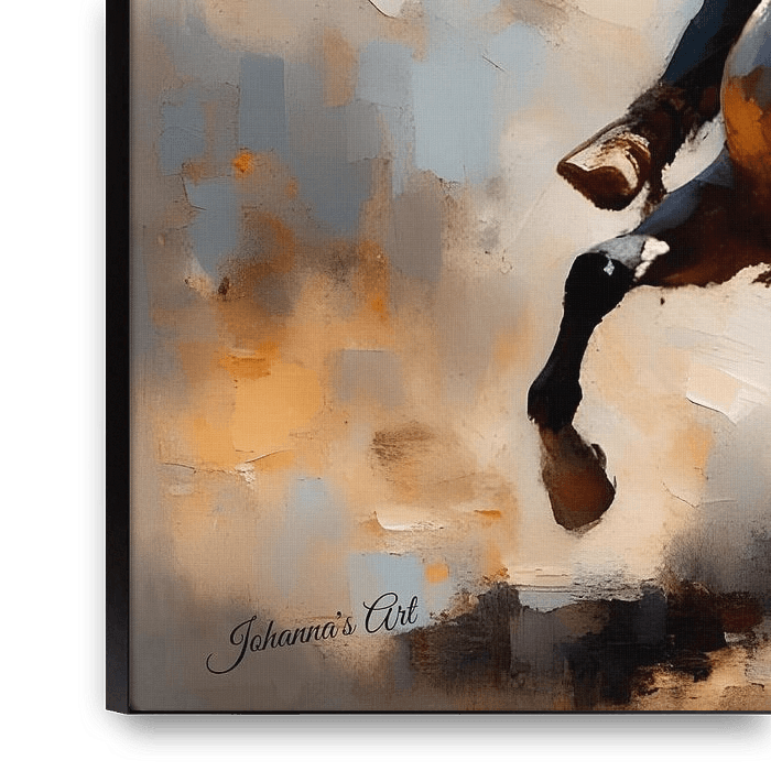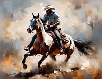 Een cowboy is afgebeeld in een dynamische beweging terwijl hij een galopperend paard berijdt, de belichaming van de geest van het Wilde Westen. De ruiter is gekleed in traditionele Western-kleding met een breedgerande hoed en lijkt geconcentreerd op zijn taak, tegen een achtergrond van warme, aardse tinten.