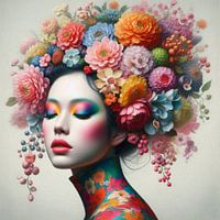 Een kleurrijk en bloemig portret van een vrouw.