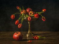 Een stilleven van een zilverkleurige coupe op voet met appels, rode Tulpen en een granaatappel op een houten tafel tegen een donkere achtergrond. In de stijl van de oude Meesters.