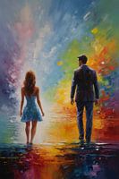 Deze levendige en expressieve weergave betovert het oog met een explosie van kleur en licht. Het kunstwerk straalt warmte en passie uit, terwijl een koppel in de verte hand in hand lijkt te wandelen, omringd door een betoverend spectrum van tinten. Het gebruik van kleur en licht brengt niet alleen een gevoel van diepte en beweging in het schilderij, maar ook een gevoel van onuitgesproken verhalen en emoties. Dit stuk zou een prachtige aanvulling zijn op elke ruimte, het biedt een ontsnapping naar een wereld waar liefde en kleur naadloos versmelten tot een perfect moment.