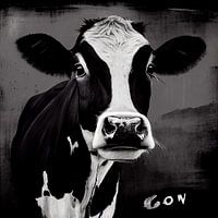 Koe in zwart witte uitvoering op een grijze achtergrond. Sober en indringend. Liefdevol en stoer. Passend bij diverse stijlen en trends. Prachtige en liefdevolle blik. De tekst cow zet kracht bij. Sober, minimalistisch, fine art.