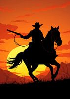 De cowboy staat in een silhouet tegen een levendige zonsondergang met een grote, fel oranje-gele zon tussen vurige oranje en rode wolken. De cowboy zit in het midden van de afbeelding, op een paard. Hij draagt een cowboyhoed en lijkt een lang geweer vast te houden dat licht omhoog is gericht. Het paard is ook in silhouet, zijn lichaam en benen zijn duidelijk zichtbaar, met zijn staart die achter hem uitsteekt. Het landschap strekt zich uit tot een heuvelachtig terrein met gras, dat ook is afgebeeld als een donker silhouet. De horizonlijn is duidelijk zichtbaar waar grond en lucht elkaar raken.