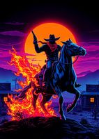 Een cowboy, silhouet in donkere tinten, rijdt op een paard dat in vlammen opgaat. Hij draagt een cowboyhoed, donkerkleurig shirt en spijkerbroek en een rode bandana.  Hij houdt een pistool vast.