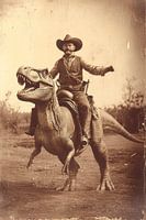 Een onvergetelijk gezicht: een cowboy met een breedgerande hoed rijdt dapper op een imposante dinosaurus. Het stoffige landschap en de wilde uitdrukking van de ruiter maken het avontuur voelbaar. Deze kronkelige mix van verleden en fantasie maakt de verbeelding los en ontvouwt een episch verhaal uit een tijd waarin mensen en dinosaurussen zij aan zij leefden.