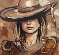 Stoer portret in bruin tinten van een vrouw met een cowboy hoed voor haar ogen.