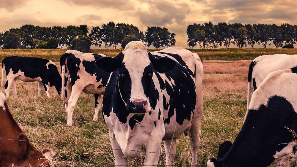 Een typisch Hollandse zonsondergang boven het Zeeuwse platteland terwijl de koeien grazen.