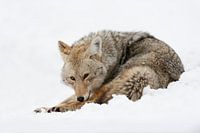 Coyote ( Canis latrans ) in de winter tijdens het borstelen en verzorgen, direct zicht op de fotograaf, zeer gedetailleerde foto, grappige scène, wilde dieren, Yellowstone NP, Wyoming, USA.