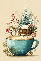 Een illustratie waarin een turquoise theekop transformeert tot een miniwereld. In de kop ontvouwt zich een winters tafereel met een gezellig houten huisje, omringd door besneeuwde dennenbomen en decoratieve rode bessentakken. De zachte, dromerige stijl en het subtiele kleurgebruik creëren een nostalgische sfeer die doet denken aan een winterse sprookjeswereld.