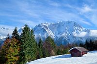 Wooden hut on snow meadows and Alps, Bavaria, Germany