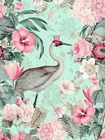 Nostalgische illustratie met gekroonde kraanvogel en bloemen in pastelkleuren
