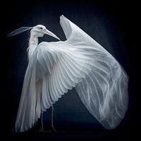 Kraanvogel met prachtig gespreide vleugels uitlopend in een sluiter. Abstract en toch ook realistisch portret van een witte kraanvogel vol met uitstraling. Statig en lief, verhullend en open. Modern Abstract. Sober. Zwartwit. Textiel. Zijde.