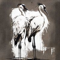 Afbeelding van twee kraanvogels op linen. Het wit van de vogel gaat op in het witte vlak erachter. Passend bij divers trends, zoals Beige en Organic.