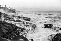 Golven beuken tegen de ruige rotsen van een kustlijn terwijl water over de stenen oppervlakken klatert, vastgelegd in een monochrome toon. Op de achtergrond ontmoet een bewolkte lucht de horizon van de zee, terwijl een kleine structuur met een rieten dak op de rand van de klif staat.