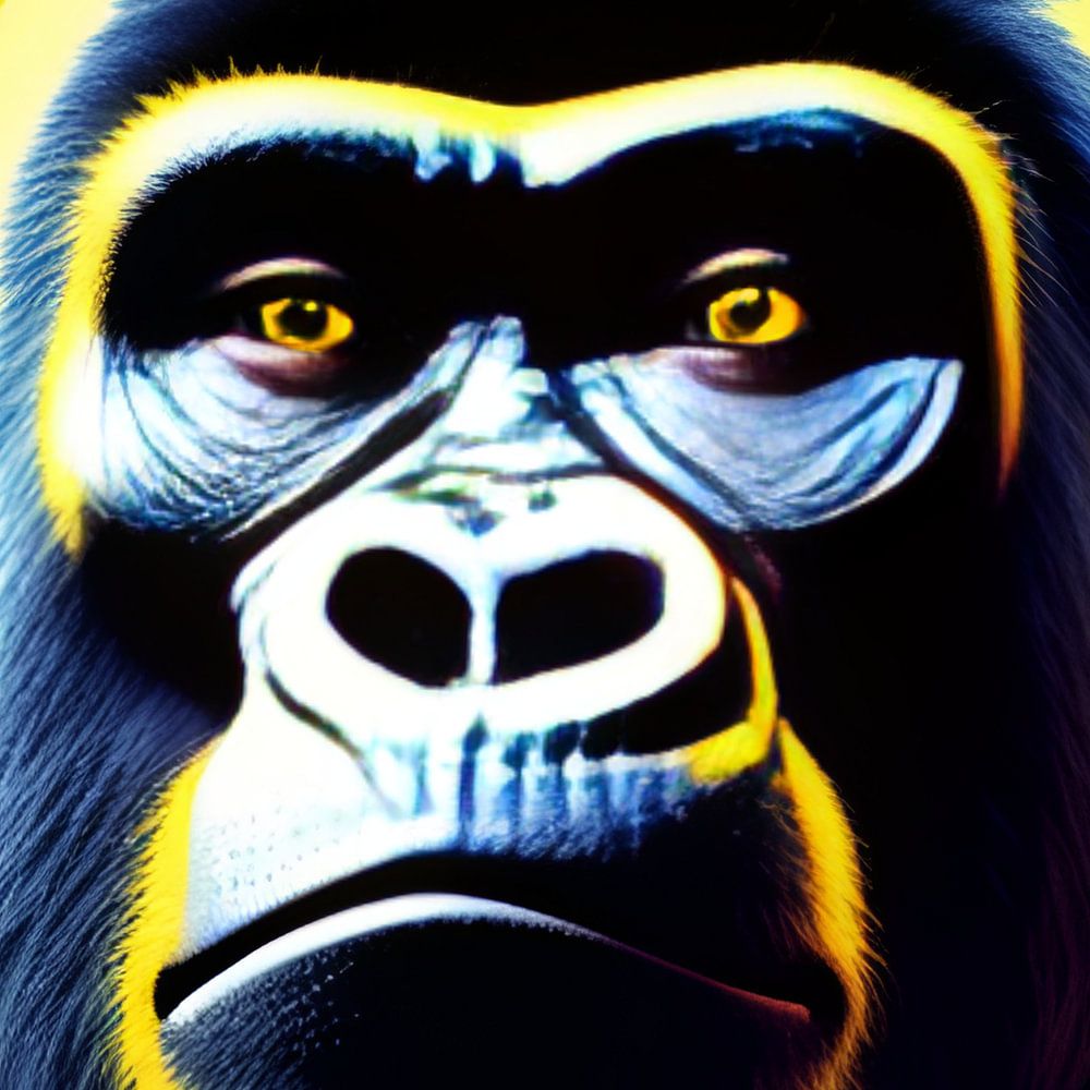 Dit kunstwerk nodigt de kijker uit om dieper in de wereld van de chimpansee te duiken, waar intelligentie en emotie samensmelten met de kleurrijke expressie van de kunstenaar. De contrasten tussen zwart en geel brengen niet alleen de kracht van de chimpansee naar voren, maar illustreren ook de subtiliteiten van zijn karakter, vastgelegd in elke penseelstreek op het canvas. Het is een meeslepende ervaring waarin de grenzen tussen kunst en natuur vervagen, en de wilde ziel van de chimpansee tot leven komt op een betoverende manier.