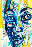 Portret. Dit is een collage van gescheurde stukken papier met daarin een full colour verloop: cyaan, magenta, geel en zwart. De blik is intens en je kunt het portret op je eigen manier bekijken en je eigen gevoel volgen.