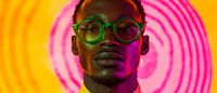 Een stralend samenspel van kleuren en vormen prikkelt de zintuigen: helder geel en zacht paars vormen samen een energieke achtergrond. De heldere, krachtige aanwezigheid van de man en zijn opvallende groene glazen creëren een modern statement. Ideaal voor de woonkamer, waar creativiteit en levendigheid naar voren kunnen komen.