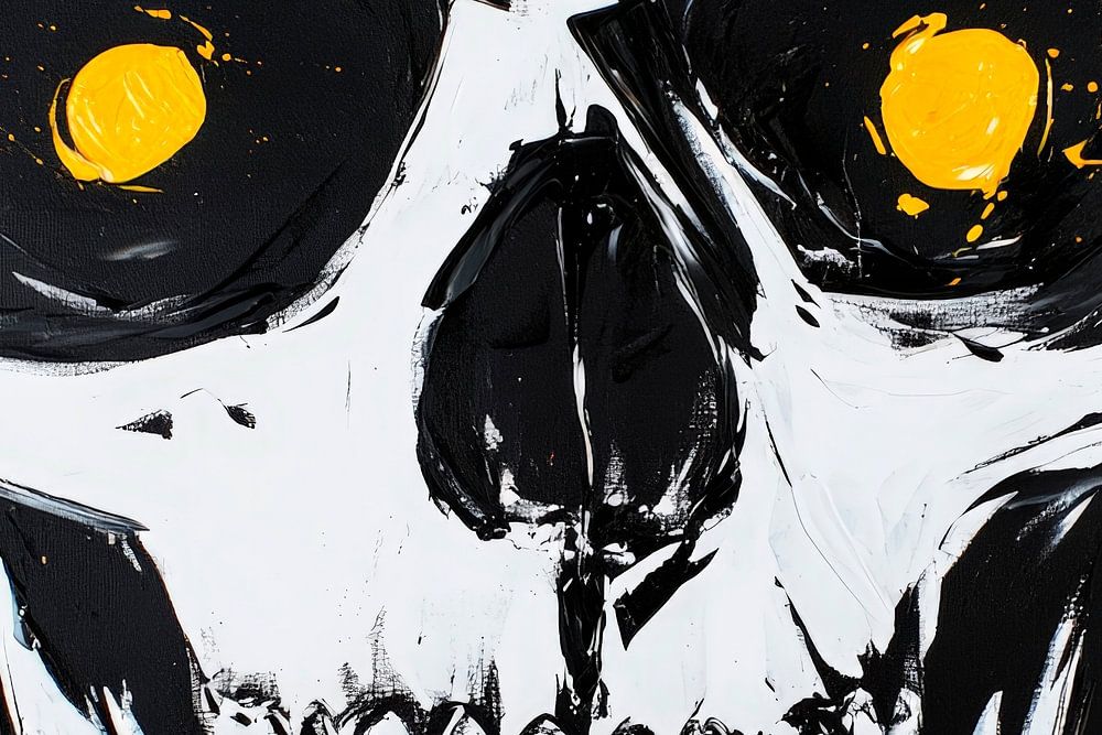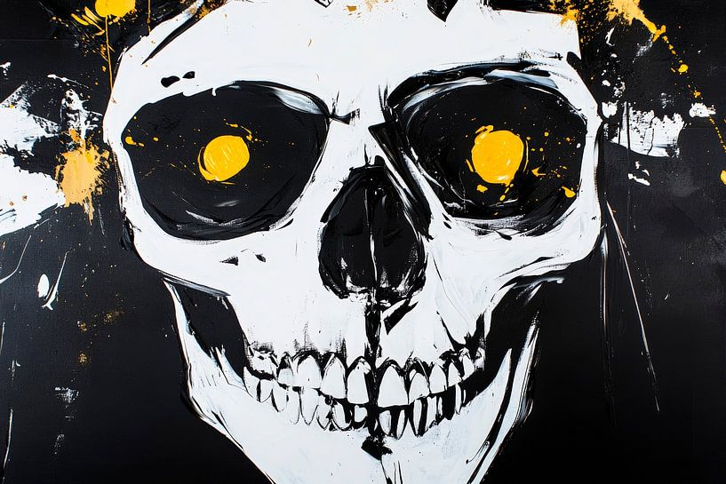Een fascinerend werk dat speelt met contrasterende kleuren en levendige accenten. De felgele ogen van de schedel trekken meteen de aandacht en geven het beeld een mysterieuze uitstraling. Ideaal voor in de woonkamer, waar het een gesprek kan stimuleren en een artistieke maar gedurfde sfeer kan creëren.