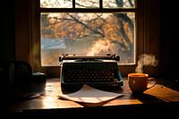 Een nostalgische sfeer overspoelt de kamer: een oude typemachine, omgeven door zachte zonnestralen, springt in het oog. Ernaast staat een kop koffie uitnodigend te dampen op een stapel losse vellen papier. Dit tafereel van creativiteit en gezelligheid ontvouwt zich perfect in een inspirerend kantoor of een rustige leeshoek.