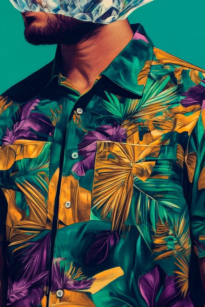 Een fascinerend samenspel van kleuren en vormen: Een persoon met een glinsterend, kristalhelder hoofdmasker straalt exotisme uit in een levendig, bloemig overhemd. De combinatie van de koele, turquoise achtergrond en de intense kleuren van het shirt geven de kamer een creatieve, avontuurlijke touch. Perfect voor een moderne woonkamer die individualiteit wil vieren.