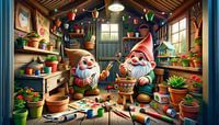 In deze kleurrijke illustratie zijn twee tuinkabouters in hun gezellige atelier bezig met het kunstig beschilderen van potten van klei. Omringd door een verscheidenheid aan kwasten, tubes verf en potten die al versierd zijn met levendige patronen, is hun creativiteit volop te zien. De aandacht voor detail is zichtbaar in elke hoek van de studio - van het goed georganiseerde tuingereedschap aan de muur tot de vele plantenpotten die de houten plank sieren. Het licht dat door het raam naar binnen valt, benadrukt de warmte en gezelligheid van de kamer en benadrukt het zorgvuldige handwerk van de kabouters, die hun passie met een glimlach nastreven.