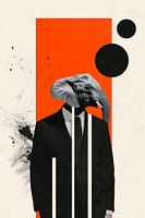 Een elegant lichaam in pak combineert op surrealistische wijze met de majestueuze kop van een olifant. Deze krachtige samensmelting van mens en dier straalt een fascinerende dualiteit uit en drukt de symbiose van intellect en instinct uit. De contrasterende kleuren en geometrische vormen geven het beeld een dynamische, eigentijdse energie die de grenzen van de werkelijkheid uitdaagt.