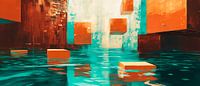 Drijvende kubussen ontvouwen zich boven glinsterend water in een fascinerend samenspel van helder oranje en rustgevend turquoise. De harmonieuze combinatie van natuur en geometrische vorm voegt dynamiek toe aan de kamer. Dit kunstwerk is ideaal voor een moderne woonkamer, creëert een ontspannen sfeer en stimuleert de verbeelding.