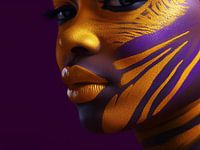 Mooi en levendig portret van een Afrikaanse vrouw met kleurrijke, artistieke ‘body art’ make-up, op een donker paarse achtergrond. Een strak uitgebalanceerde compositie met prachtige contrasten en levendige kleurencombinaties, een mix van goud en paarse tinten. Een prachtig contrast en levendige kleurencombinatie komt samen op een…