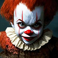 ai beeld van een creepy clown in een duistere setting met kleuren oranje en wit.