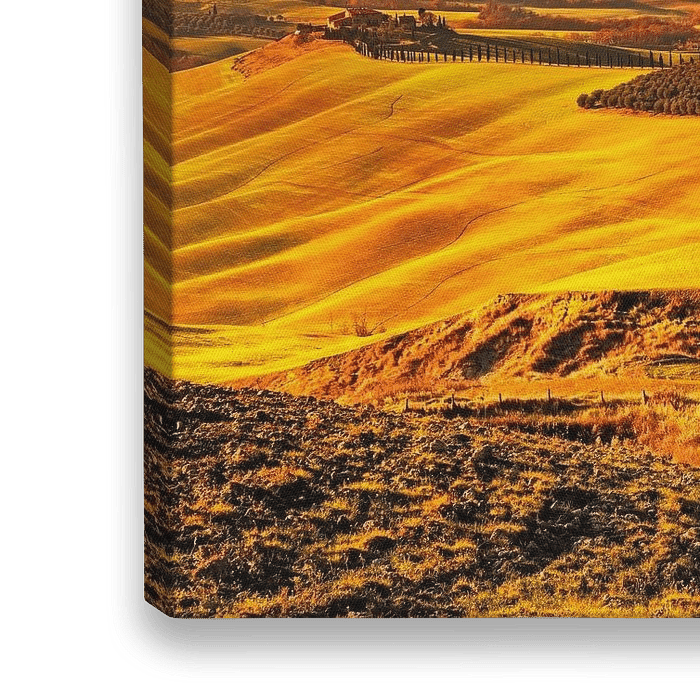 Glooiende heuvels, velden van groen en goud en lijnen van cipressen creëren een schilderachtig tafereel.