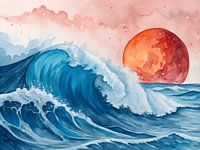 Een levendig aquarelschilderij vangt de rauwe kracht en schoonheid van een grote oceaangolf terwijl deze opkomt en neerstort. Het turbulente blauwe en witte water wordt verlicht door de warme gloed van een groot, vurig rood en oranje hemellichaam, mogelijk een maan of zon, die ondergaat of opkomt aan de horizon. Spatten wit schuim en…
