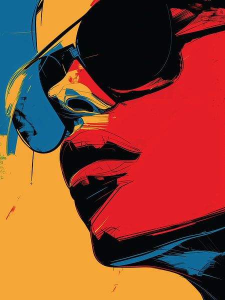 Dit kunstwerk toont een gedurfd profielportret met een oversized donkere zonnebril, scherpe zwarte lijnen en een intens contrast tussen karmozijnrood, goudgeel en diepblauwe tinten. De compositie is strak bijgesneden om de nadruk te leggen op houding, vorm en kleurimpact, waardoor het werk een sterke popart- en modeposteruitstraling…