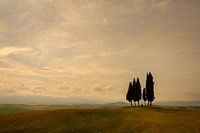 Croce di Prata bij zonsopkomst. Het is een veel gefotografeerd groepje cipressen rond een kruis op een heuveltop bij San Quirico d'Orcia, midden in de Val d'Orcia in Toscane, Italië.