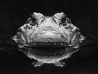 Een close up zwart-witfoto van een krokodil, met enkel zijn kop boven het wateroppervlak. De achtergrond is volledig zwart, wat de focus op de scherpe, glanzende ogen en de ruwe textuur van de bek versterkt.