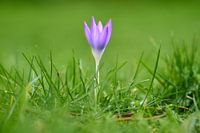 De Krokus is een natuurlijk symbool voor het voorjaar. Hier gefotografeerd vanaf de grond door het gras heen.