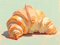 Croissant Kunst - Dit realistische schilderij toont een nauwkeurig gedetailleerde en textuurrijke croissant tegen een zachte pastelkleurige achtergrond, waarbij de focus ligt op de goudbruine en ivoorwitte tinten die het brood zijn aantrekkelijke uiterlijk geven.