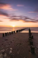 Een heldere zonsondergang aan het strand van Domburg, gezien tussen de golfbrekers.