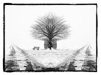 Een kruispunt van wegen bij het Eyserbos tussen Elkenrade, Eyserheide en het Eyserbos heeft model gestaan voor deze "splitsing" van wegen in een minimalistisch winter landschap. De symmetrie in het beeld wordt doorbroken door het wegkruis en de zitbank.