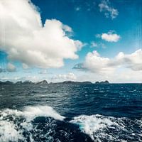 Ruwe zee tijdens een overtocht van Funchal, Madeira naar het naburige eiland Porto Santo. Het schiereiland Sao Lourenço ligt in het ZW.
