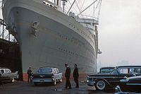 Nederlands erfgoed, in 1959 gefotografeerd aan de kade van New York: het stoomschip Nieuw-Amsterdam II, gebouwd voor de Rotterdamse Holland-Amerika Lijn. De HAL was bijna een eeuw lang de snelste manier om van Nederland in de Verenigde Staten te komen. En eventueel weer terug. De Nieuw-Amsterdam was het vlaggenschip van zijn tijd, en volgens velen het mooiste Nederlandse passagiersschip ooit gebouwd. Stel je voor: deze imponerende boeg als kunstwerk boven jouw bank!