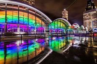 De Cruise Terminal Rotterdam aan de Wilhelminapier. Prachtig uitgelicht tijdens de feestdagen. Op de achtergrond de Montevideotoren met een sterke laserstraal richting het centrum van Rotterdam