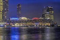 Het 300 meter lange en fraai verlichte cruiseschip Aida Perla ligt aangemeerd bij de cruiseterminal op de Wilhelminapier in Rotterdam tijdens het blauwe uur na zonsondergang.