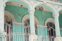 Close-up van het balkon van een oud gebouw in Havana, Cuba. Een plek die, zo stel ik me voor, in het verleden een prestigieus gebouw was. Spectaculaire zuilen en houtsnijwerk tonen een rijke architectonische stijl. Maar nu groeit er een plant op het plafond. Roestige balustrades, versleten muren, ramen die in jaren niet zijn schoongemaakt, en een gevoel van verval en verloedering zijn aanwezig.