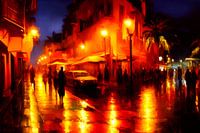 Deze compositie roept een warme, uitnodigende sfeer op, doordrenkt met levendige kleuren die de zintuigen prikkelen. Het beeldt de levendigheid van een tropische nacht in Cuba uit, waar warme tinten van diepblauw, rijk paars en glinsterend goud de nachtelijke hemel verlichten.